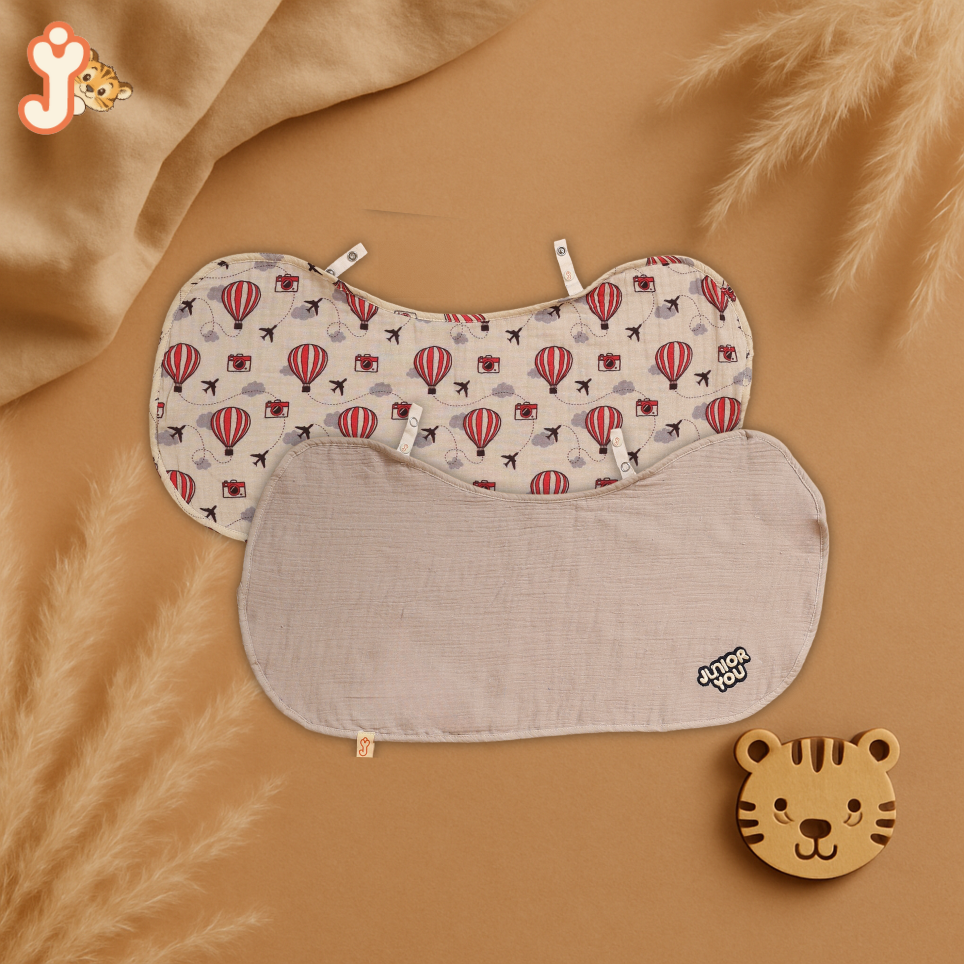 Junioryou Organic Cotton muslin Bib/Burp Cloth for babies (Pack of 2) - Balloon Safari & Solid Grey