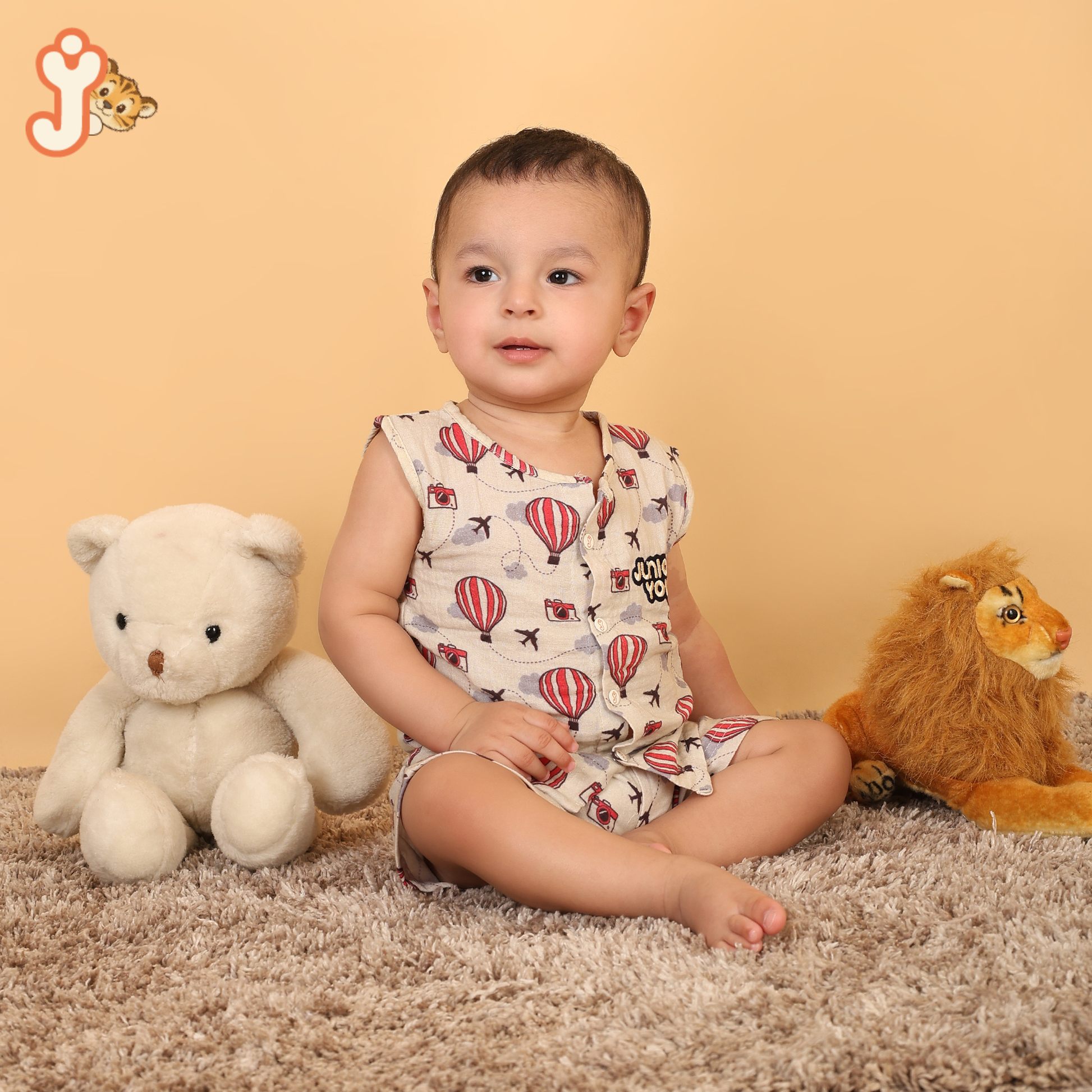 1 Jhabla Set : A sleeveless Balloon Safari jhabla with matching bottoms (shorts or bloomers), featuring custom Junioryou snap buttons and soft elastic waist for rash-free comfort.
