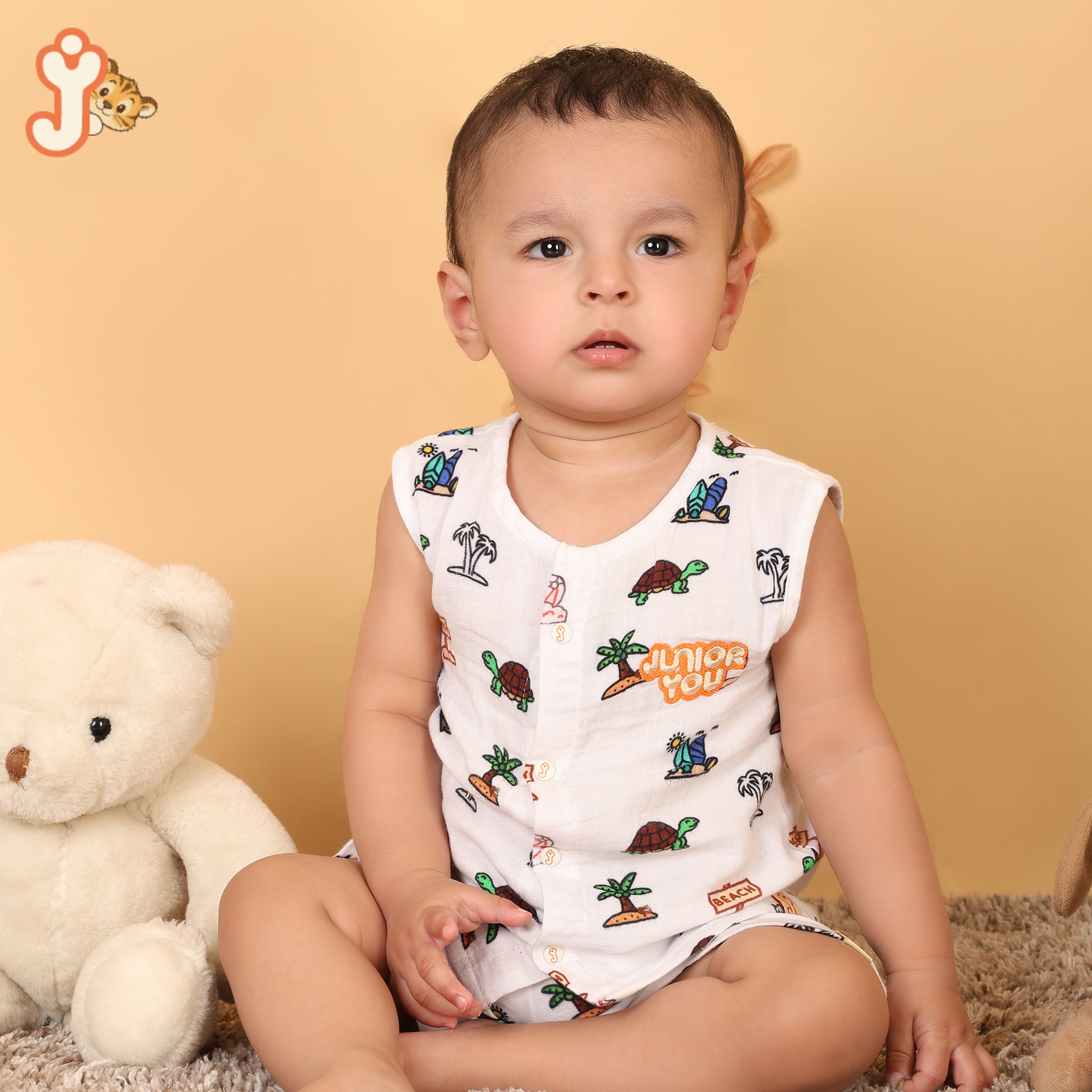 1 Jhabla Set : A breezy sleeveless muslin jhabla with custom Junioryou snap buttons, paired with soft elasticated bottoms (shorts or bloomers) for everyday comfort.