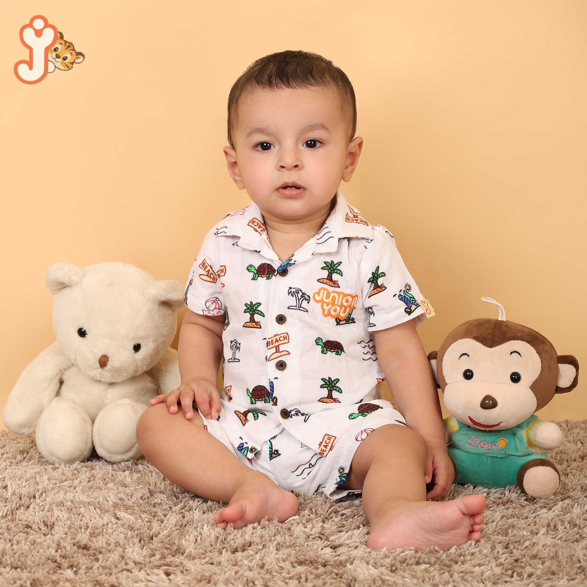 1 Shirt & Shorts Co-ord Set : A breezy short-sleeve shirt made from double gauze muslin with coconut shell buttons, paired with soft drawstring shorts featuring cross pockets for added comfort.