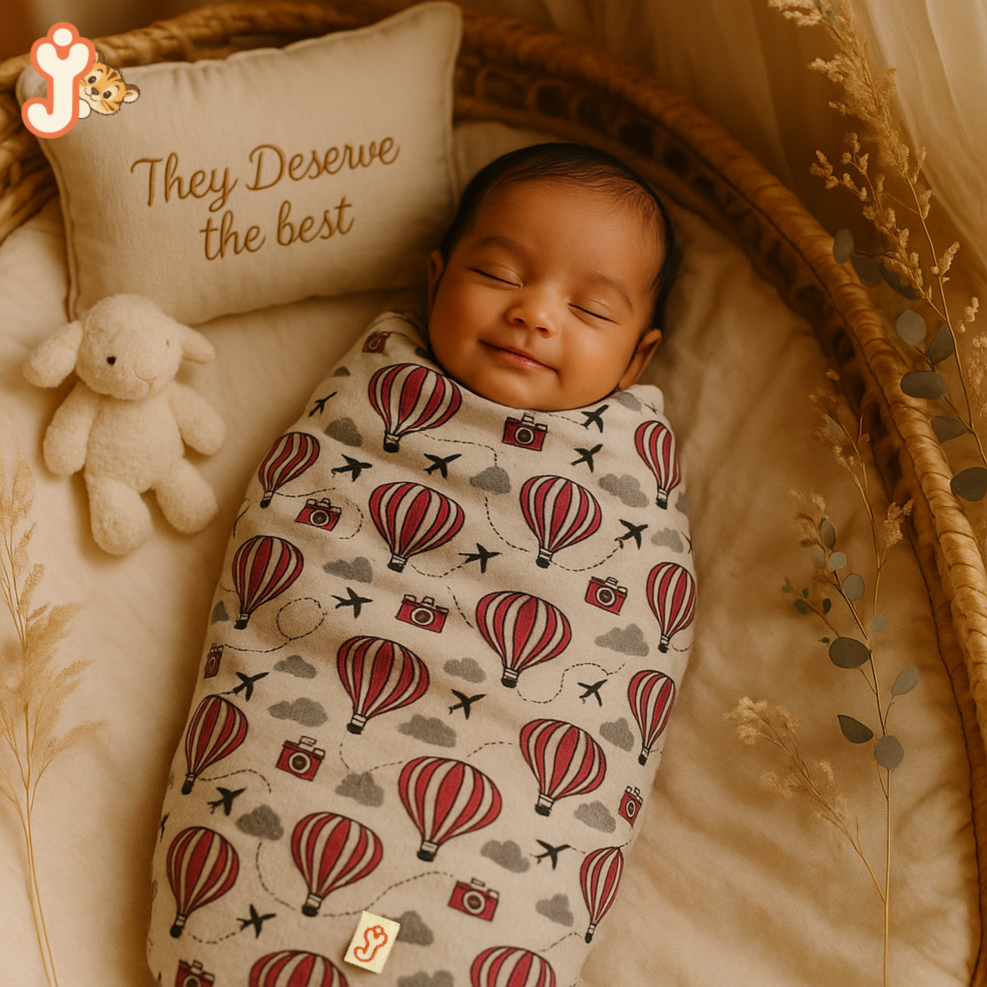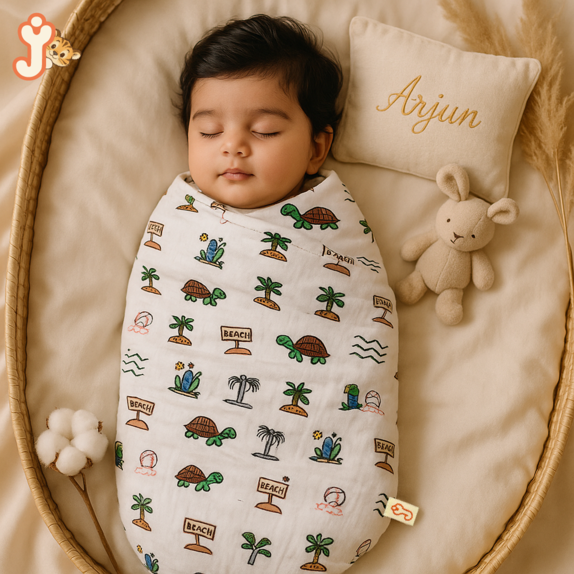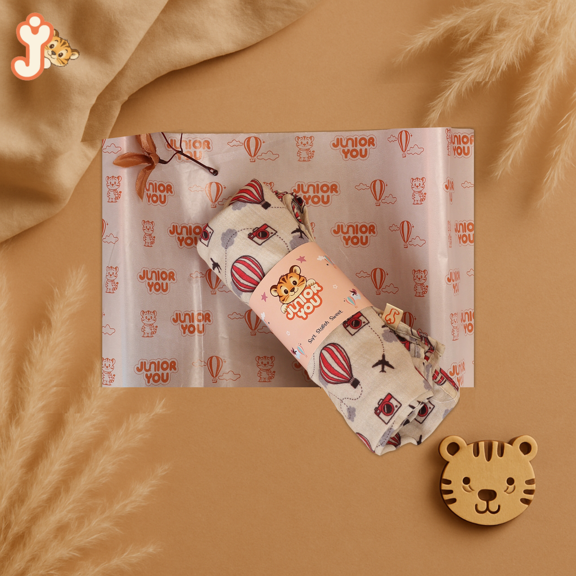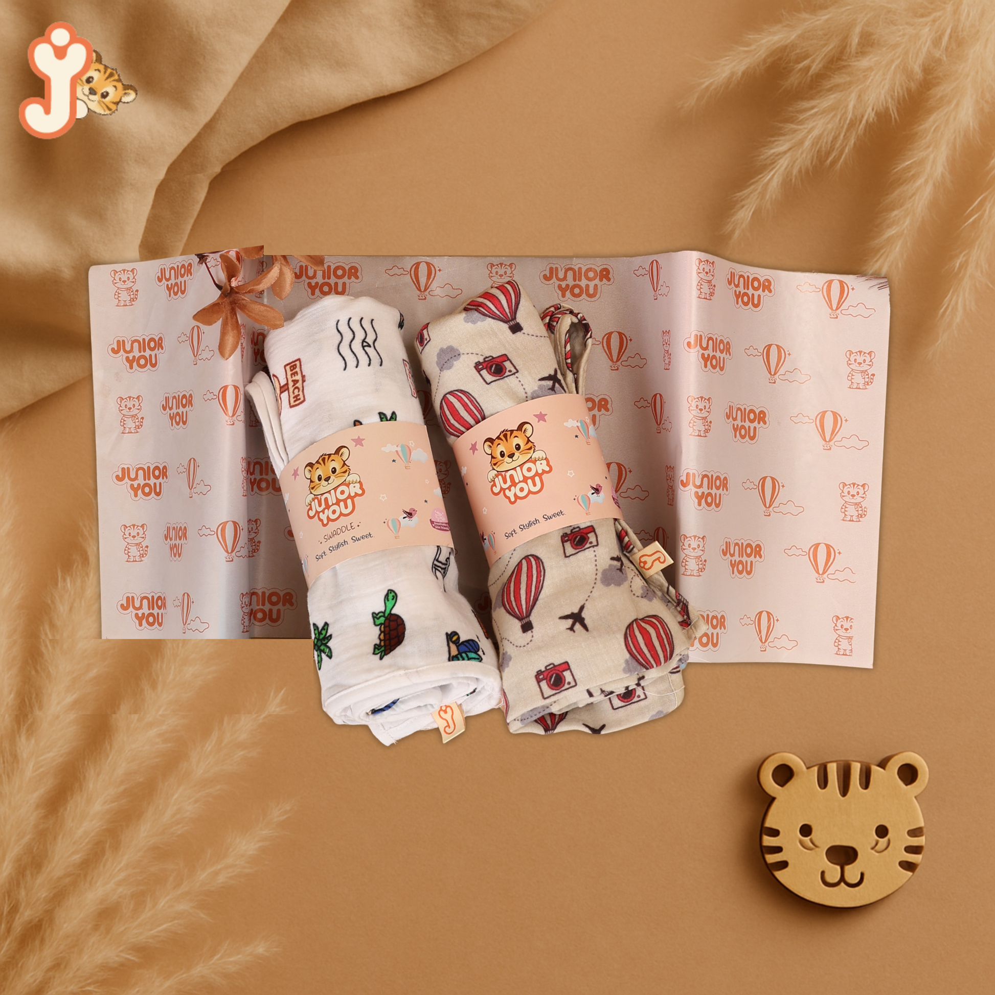 Embrace your baby's early days with this thoughtfully curated pack of 2 JuniorYou swaddles, featuring our signature Balloon Safari and Sandy Toes Holiday prints. Lovingly made from GOTS-certified double gauze organic cotton muslin, these swaddles are breathable, lightweight, and incredibly gentle on delicate skin — the perfect blend of comfort and charm.