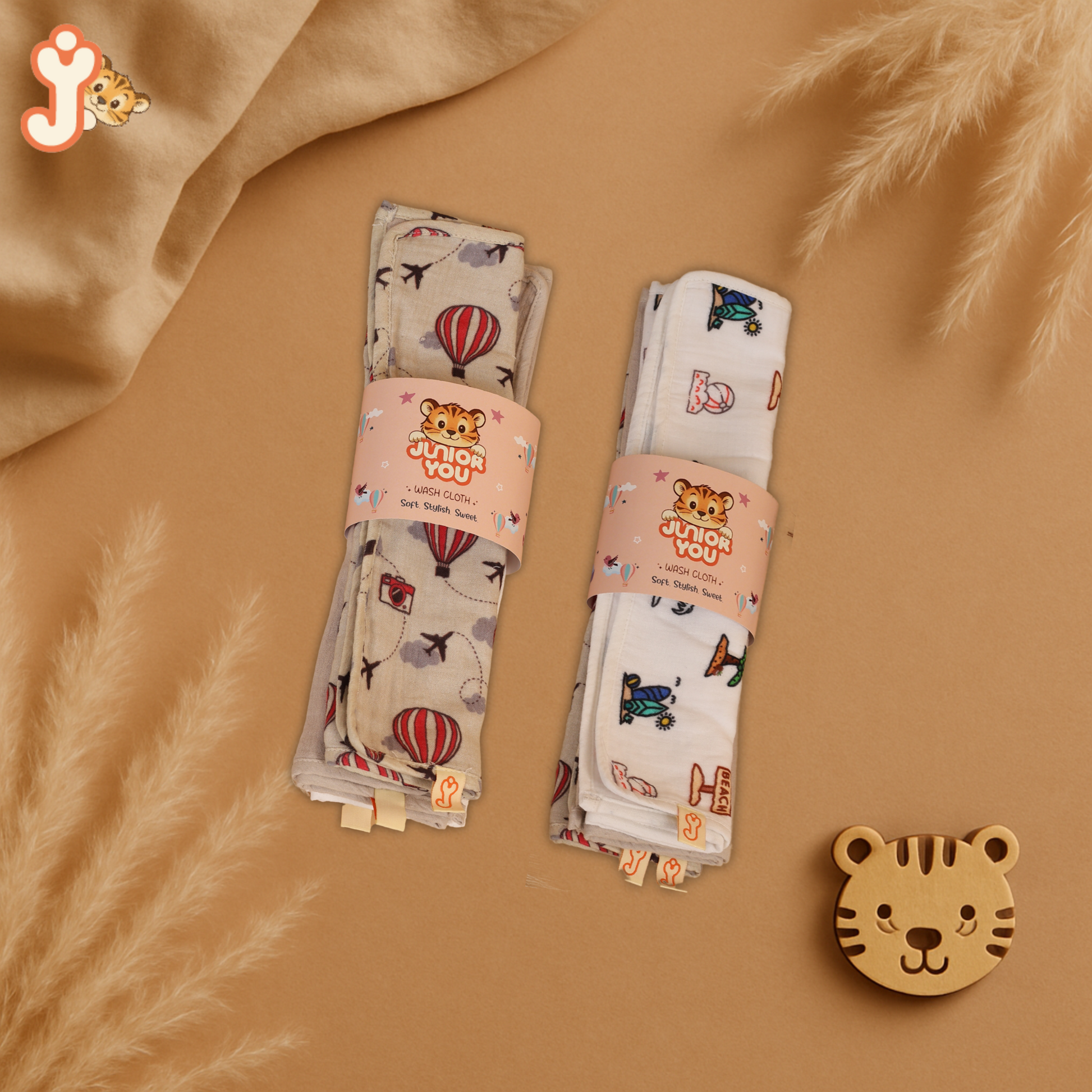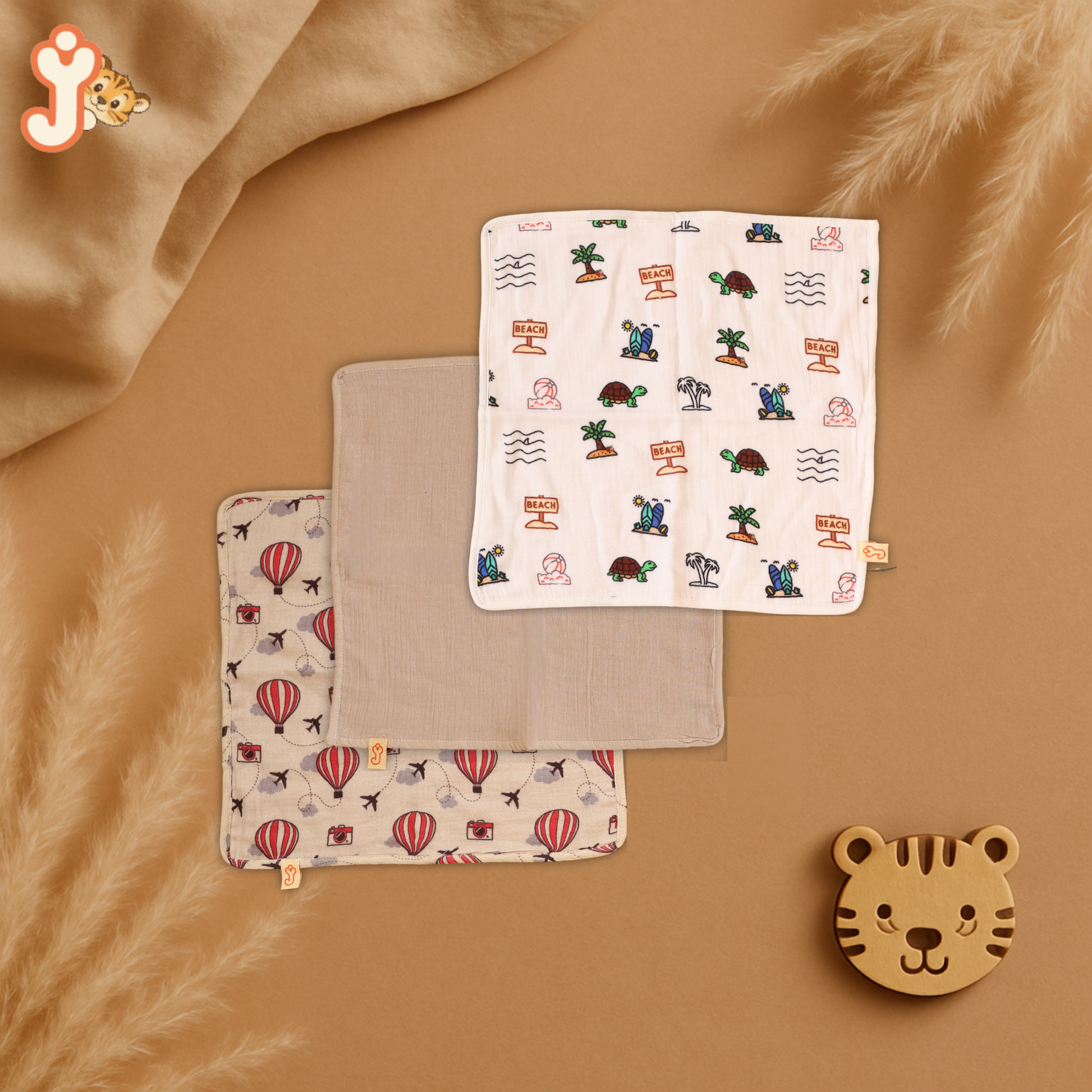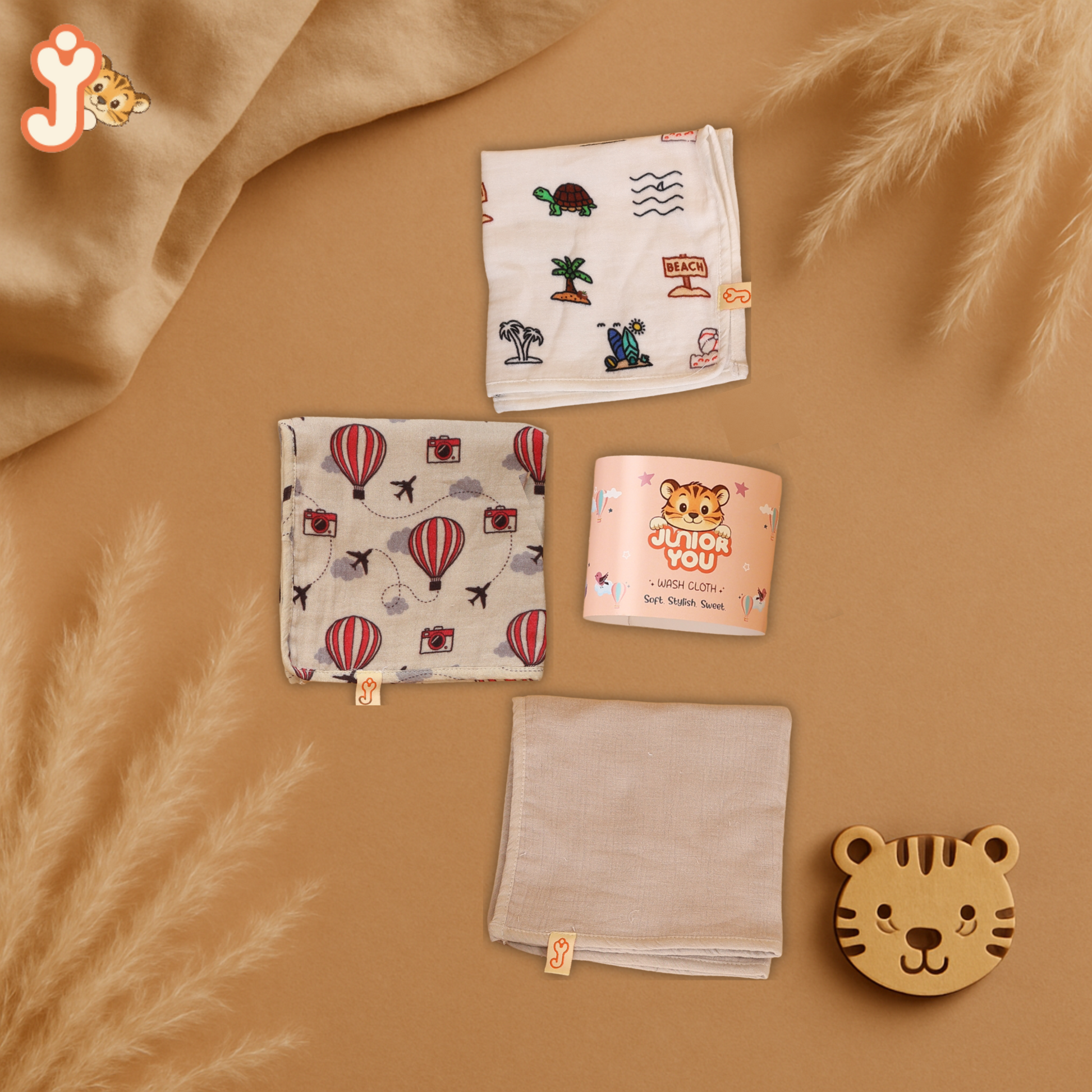 Junioryou Organic Cotton muslin Wash cloth for babies (Pack of 3) - Balloon Safari, Sand Toes Holiday & Solid Grey